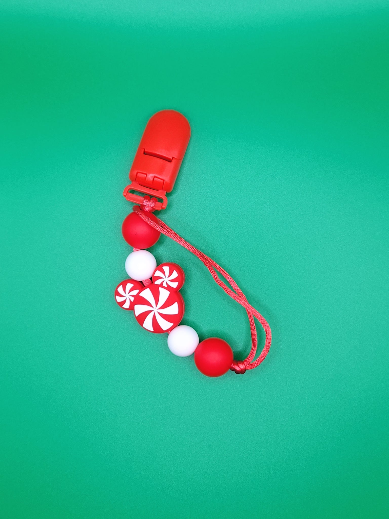 Pacifier drops? Not on our watch, mama! Our pacifier clip is here to save the day (and your sanity). Featuring a peppermint mouse bead, and bold swirls, this clip is as festive as it is functional.